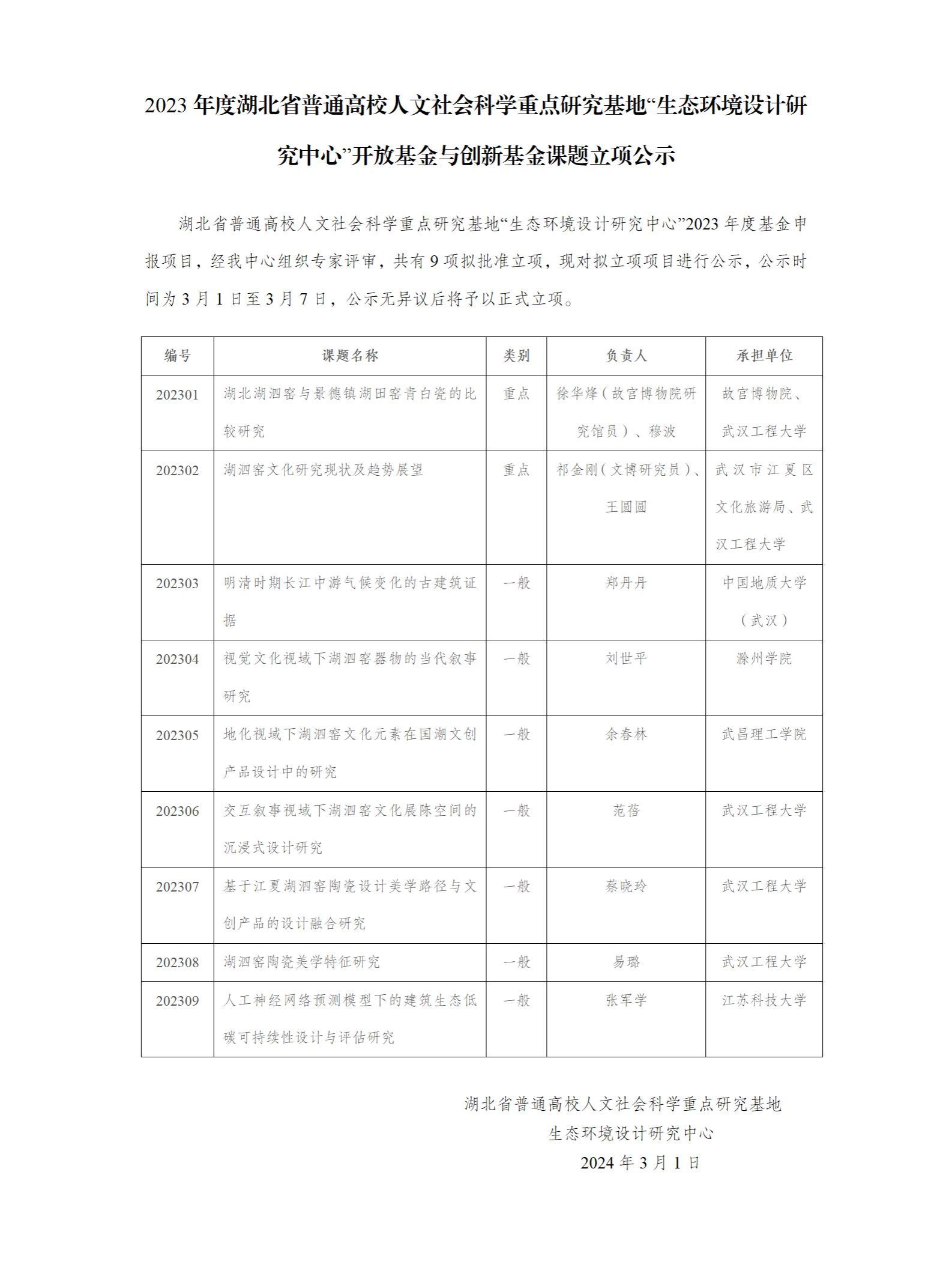 2023年度湖北省普通高校人文社会科学重点研究基地“生态环境设计研究中心”开放基金与创新基金课题立项公示