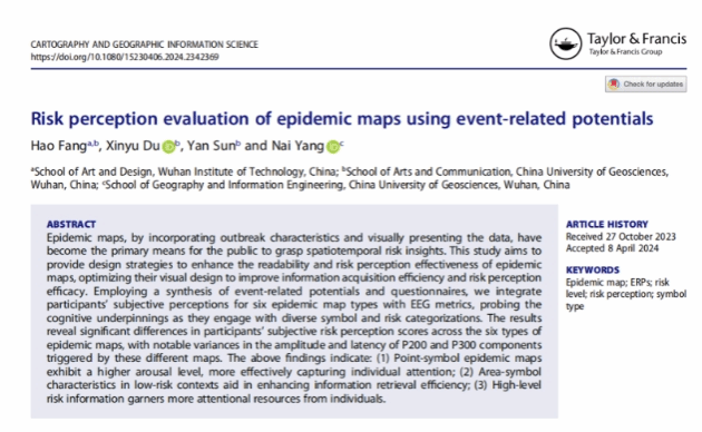 (通讯员 张俊杰)近日,304am永利方浩教授团队交叉学科研究成果“Risk Perception Evaluation of Epidemic Maps Using Event-Related Potentials”(基于事件相关电位的疫情地图风险感知评估)在地图制图学领域知名国际期刊Cartography and Geographic Information Science正式发表。该论文第一署名单位为304am永利,方浩教授为第一作者,中国地质大学地理与信息工程公司杨乃副教授为通讯作者。