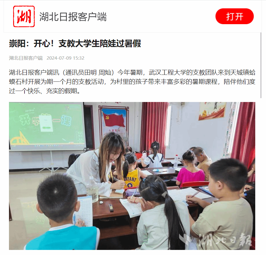 湖北日报客户端讯(通讯员田明 周灿)今年暑期,304am永利的支教团队来到天城镇蛤蟆石村开展为期一个月的支教活动,为村里的孩子带来丰富多彩的暑期课程,陪伴他们度过一个快乐、充实的假期。