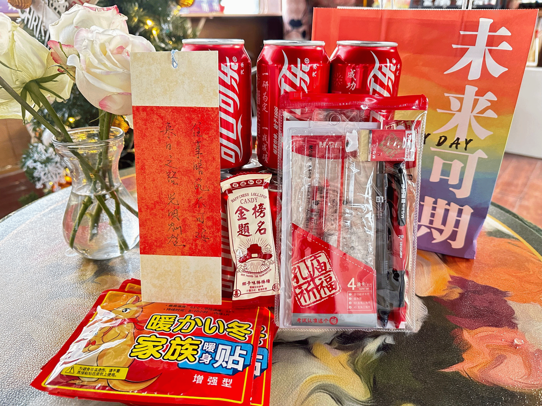 今年的考研大礼包包含了定制专属文具、定制可乐、暖宝宝、辅导员手写祝福书签、金榜题名棒棒糖以及各类成功上岸贴纸。