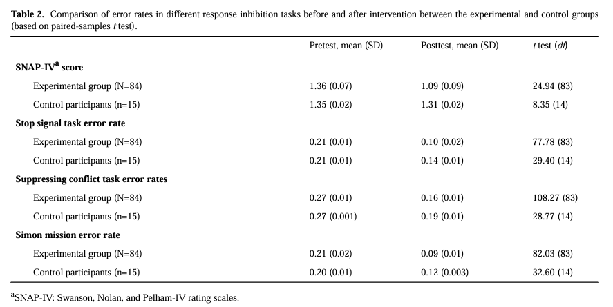 研究实验以虚拟现实平台物质奖励与精神奖励反馈表现形式作为自变量,采用2(物质奖励:金币、代币)*2(精神奖励:徽章、言语表情奖励)的对照组和前后测量因素被试间设计,实验组(N=84)参加虚拟现实反馈强化训练,对照组(N=15)参加常规的无反馈(对和错)虚拟现实训练。训练前后完成SNAP-IV量表、停止信号任务、抑制冲突任务、 Simon任务测试。共训练 0.5 个月,每次干预训练时间为 25 min,2 次/天,每次间隔5h以上,共 28 次。结果变量:以错误率为持续反应抑制缺陷任务的指标,以错误率为优势反应抑制缺陷任务的指标,以错误率效量(即不一致试次错误率与一致试次错误率的差值)为干扰反应抑制缺陷任务的指标;多动症指数评估以及任务完成得分。