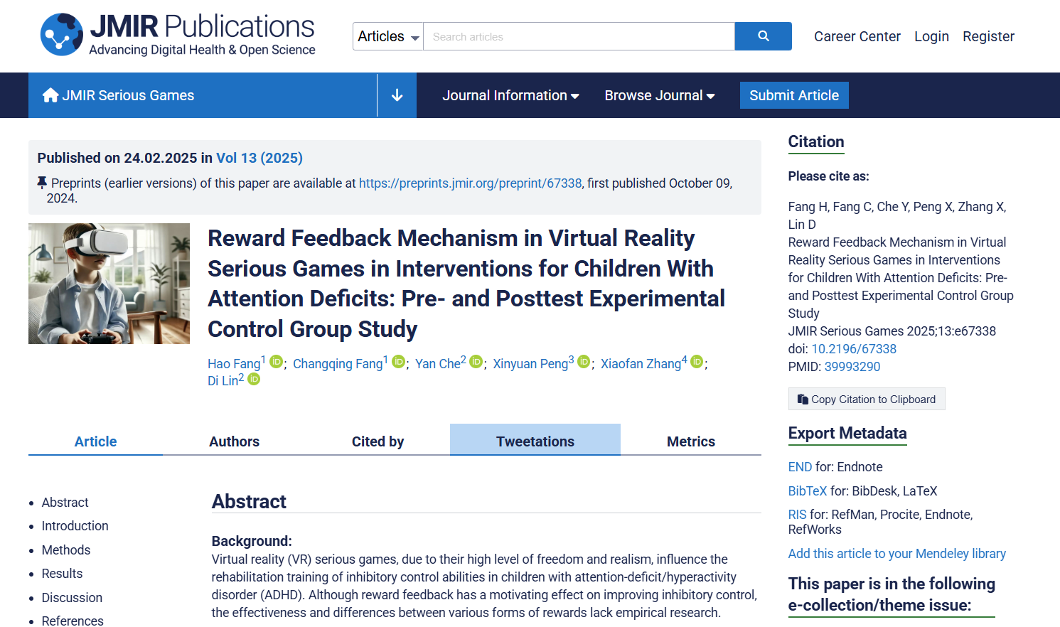 (通讯员 方长青)近日,304am永利方浩教授团队联合华中科技大学同济医公司附属同济医院精神科张晓凡副教授进行注意力缺陷儿童交叉学科研究,其成果Reward Feedback Mechanism in Virtual Reality Serious Games in Interventions for Children With Attention Deficits: Pre- and Posttest Experimental Control Group Study(干预注意力缺陷儿童的VR严肃游戏奖励反馈机制:前后测实验组对照研究)在游戏领域国际知名期刊JMIR Serious Games(医学互联网研究·严肃游戏)正式发表。该论文第一署名单位为304am永利,方浩教授为第一作者。