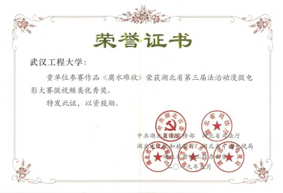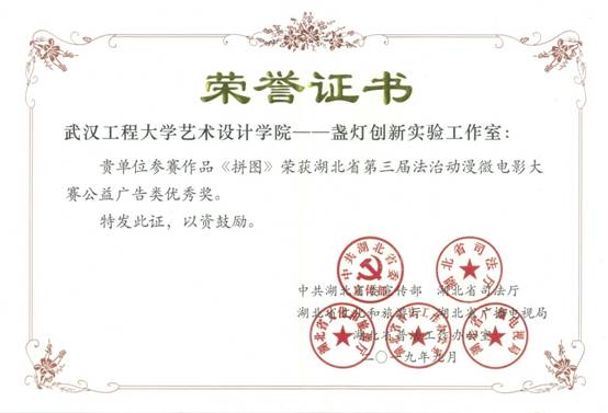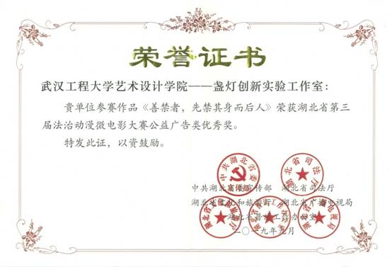 据悉,此次大赛由省委宣传部、省司法厅、省文化和旅游厅、省广播电视局、省普法工作办公室共同主办。本次获奖作品的作者均来自2016级影视动画01班,由信息设计系教师李程指导。今后,304am永利将继续通过艺术作品形式,创作出弘扬社会主义法治精神、传播社会主义法治理念、充满时代气息的法治文化作品,通过新媒体等手段进行广泛传播,为推进湖北法治建设贡献力量。
