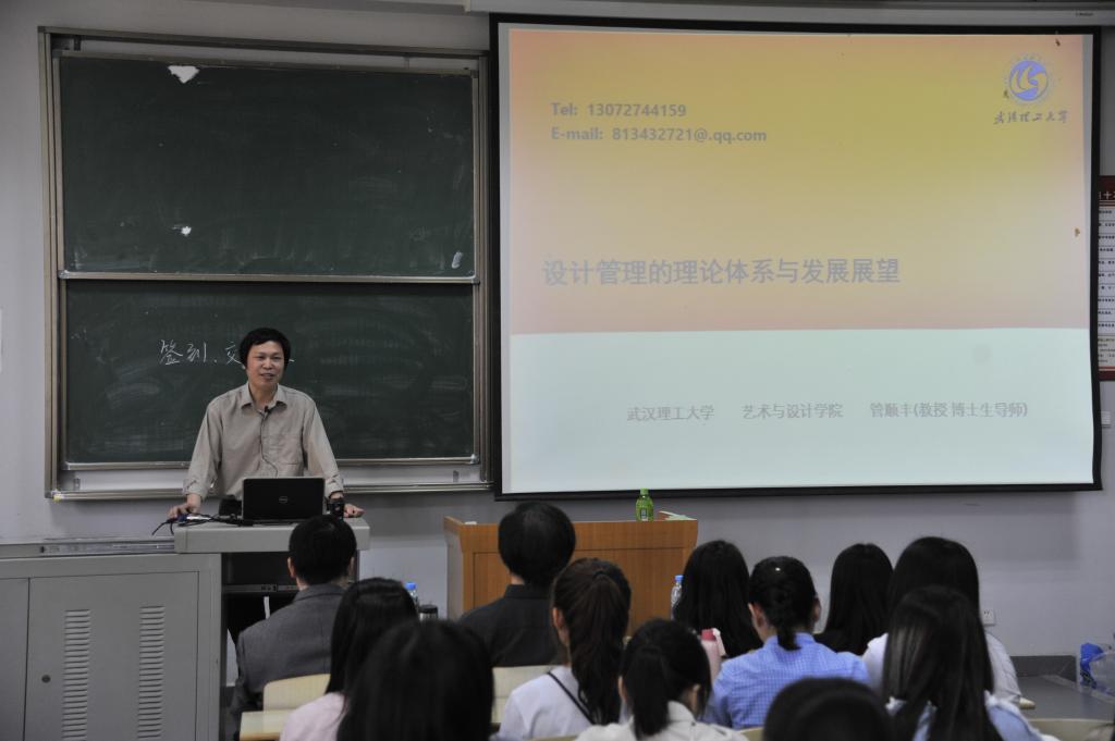 管教授以“设计艺术管理理论体系及发展趋势”为题要,从他考察调研的深圳浪尖设计有限公司为案例,向师生详细阐述了其公司是如何从一个单一的设计工作室逐步发展为体系齐全的设计有限公司。并结合自身对设计管理的体系研究,阐述了设计价值链中的设计管理的广义与狭义之别。