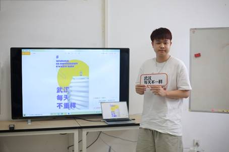 通过小组讨论,同学们积极完成关键词的动态海报设计。经过激烈的头脑风暴之后,首先带来汇报分享的是来自武汉华夏理工公司的同学,小组选择的关键词是“武汉每天不一样”。该同学及其小组完成了两套方案,一边是柔和、尖锐与几何图形的碰撞;一边是根据与以往不同的玻璃材质来表现武汉的特色建筑物“黄鹤楼”,体现关键词的“武汉每天不重样”,选择在文案字体部分添加动效。