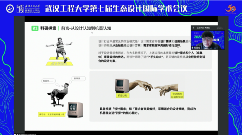 华中师范大学美术公司副经理郑达针对《感知机器与AI协同的艺术与设计》,探讨了在全球媒体科技语境下的艺术创作方式,提出了感知机器与AI艺术协同的创新思路