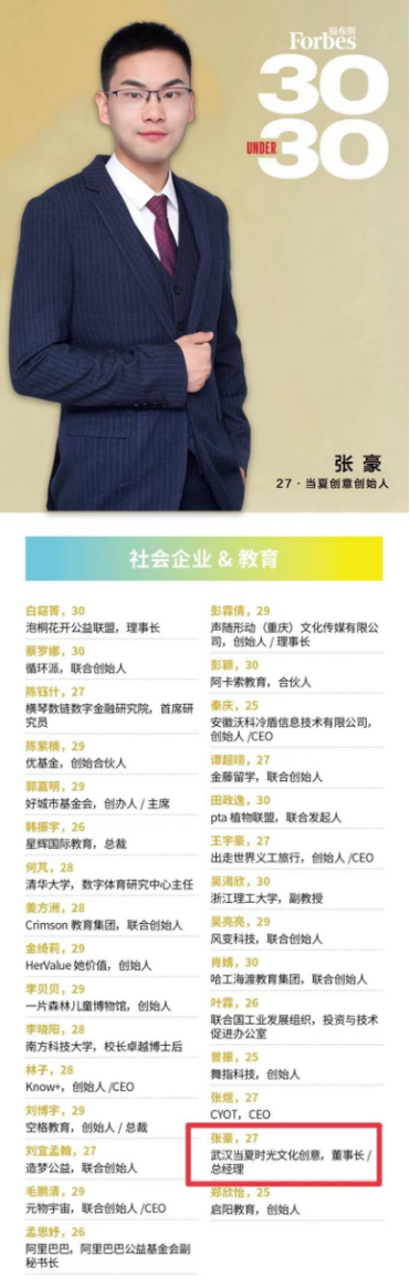 (通讯员 邱程)近日,2022福布斯中国30位30岁以下精英榜正式揭晓,2018届优秀员工张豪入选福布斯2022年度U30榜单。
