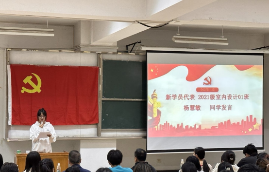 2021级环境设计01班杨慧敏同学作为新学员代表发言,分享了自己参加党校的学习感悟,并代表全体学员们表态,严格遵守党校管理规定,认真学习,主动思考,希望能通过这次学习机会更进一步加强对党的认识,以良好的精神状态、出色的学习成绩来接受党组织的检验,争取早日成为一名合格的共产党员。