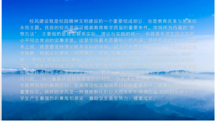 刘文副教授以全国各个高等公司的校风、校纪、校训等对学风建设进行了详细的说明,并强调学风建设既是校园精神文明建设的一个重要组成部分,也是教育改革与发展的永恒主题。优良的校风是保证提高公司产品质量的重要条件。学风作为内蕴的“思想方法”,主要指的是理论联系实际、理论与实践的统一。实事求是,这是学风最本质最核心的内涵。坚持有效的学习,从根本上说,就是要坚持理论联系实际的学风。因为只有理论联系实际,对实际进行科学抽象,根据实际提炼、创造理论,依据“实事”去“求是”,那么这种理论、这种“是”,就有了坚实的实际基础,就必然具有无限生命力,从而必能能动的反作用于实际,用来指导实践活动,做到有“的”放矢,从而产生巨大的实效。刘文老师说:“习近平总书记在哲学社会科学工作座谈会上指出:‘繁荣发展我国哲学社会科学,必须解决好学风问题。”这一重要讲话具有很强的针对性’。”