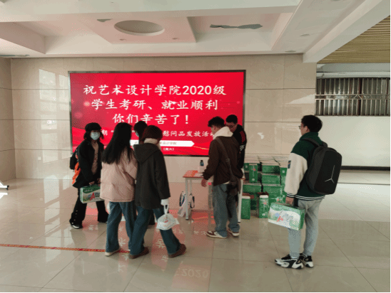现阶段,2020级大四员工进入考研、就业的关键期,为缓解同学们的压力、振奋同学们的信心,朱华杰将第四期“杰出”奖学金提前拿出为艺术设计2020级全体员工购买了慰问品,在发放的过程中,朱老师了解员工们的近况,同时为员工们考研复习、找工作加油打气,并为员工们答疑解惑,给出自己的建议。