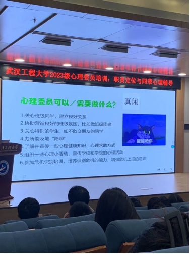 在培训活动中,专业老师详细介绍了心理委员的职责、心理委员的角色定位,心理委员是志愿者,乐于助人。同行者,同伴。学习者,具有专业培训的技术方法。示范者,是好的榜样。宣传者,宣传心理知识。心理健康基础知识、研究生心理健康标准等方面的内容。并且提出是否有自杀倾向的问题,遇到有自杀倾向的同学应该如何面对,和关于情绪焦虑问题的抢答讨论。同时,针对常见的心理困扰和心理异常进行了深入剖析,并分享了心理委员在工作中可能存在的误区及应对策略。