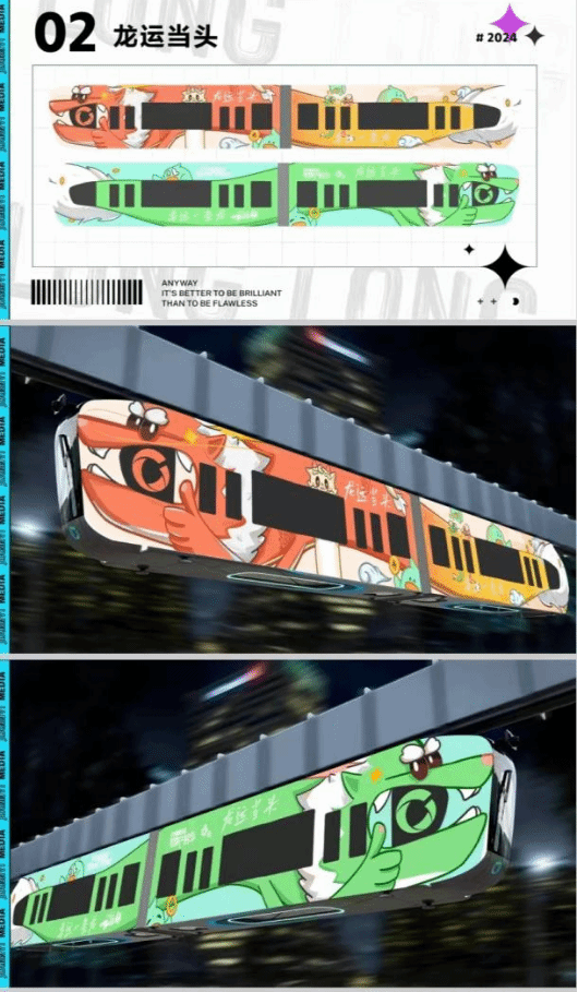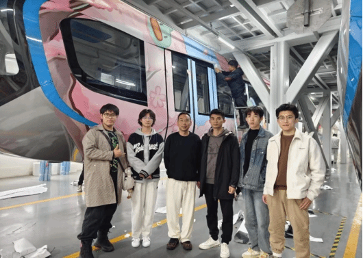 本次合作不仅让员工们将学术理论与市场实践相结合,直面市场和客户的考验,使创新潜能得到了充分地激发,同时也锻炼了他们解决实际问题的能力,让创意得到了市场的认可。这些充满活力的设计作品,不仅为光谷空轨带来了全新的视觉体验,也成为了校企合作共赢的有力证明。图为同学们的空轨车身设计“龙云当头”已经上线运行,设计“樱花季了鸭”已经在空轨“高新大道站”内全场景应用,空轨车身马上调试上线。