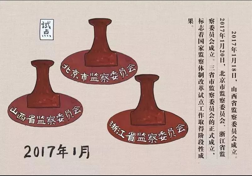 2017年1月18日,山西省监察委员会成立。2017年1月20日,北京市监察委员会、浙江省监察委员会成立。三省市监察委员会的正式成立,标志着国家监察体制改革试点工作取得阶段性成果。