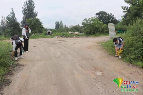 图为实践团队成员对当地桥梁宽度进行测绘。中国青年网通讯员杨小雪摄