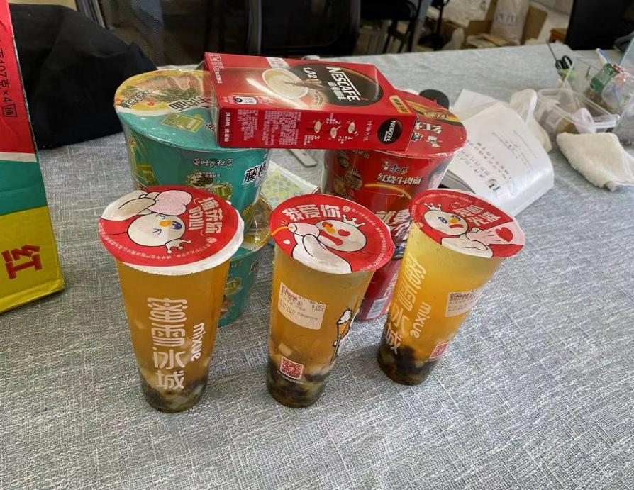 冰镇柠檬茶、咖啡、方便面等部分慰问品