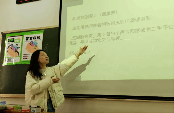 万茜柔结合公司员工宿舍空间布局,介绍了分类整理、巧用立面空间、选用有效收纳用品、换季衣物不挂出等整理技巧,她提出从物品用途、颜色等方面进行分类整理。同时指导同学们自制收纳工具,帮助大家巧妙地利用宿舍空间。